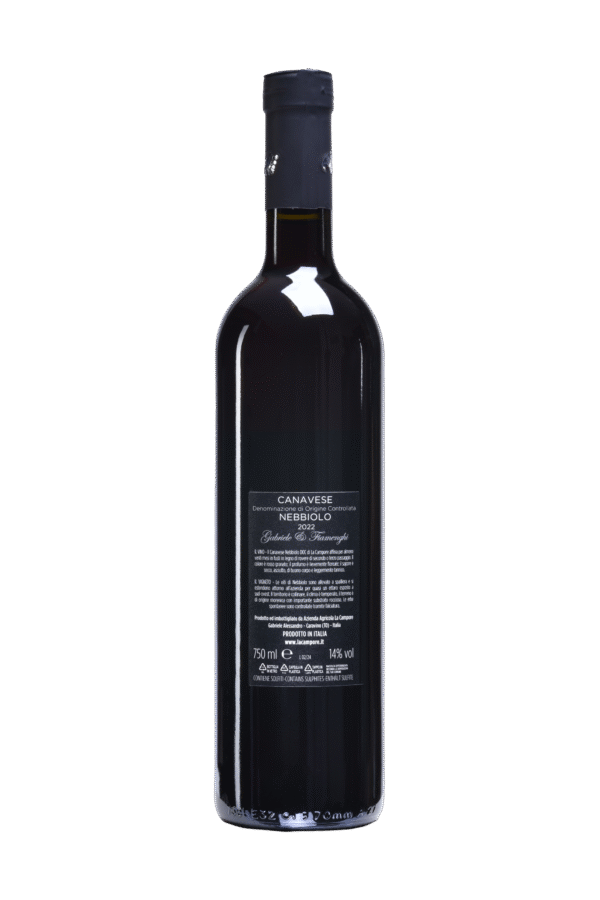 Prodotto con sole uve Nebbiolo, il Canavese Nebbiolo DOC Biologico presenta colore rosso granato con riflessi aranciati e profumo lievemente speziato e floreale. Al palato è asciutto, secco, di buon corpo e leggermente tannico.